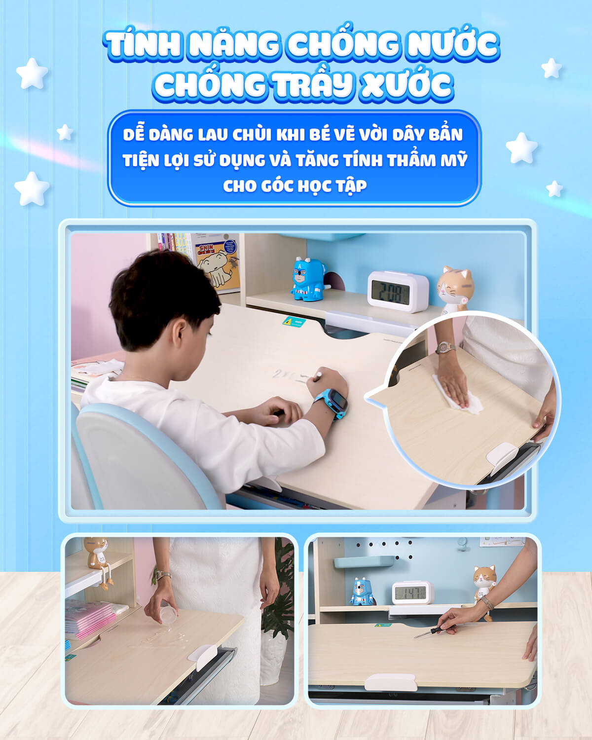 Hơn thế nữa chất liệu của mặt bàn học có lớp chống xước, từ đó bé có thể dùng viết lông không dầu vẽ trực tiếp lên mặt bàn và xóa một cách dễ dàng. Việc này giúp bé thỏa sức sáng tạo, có cảm hứng vẽ, học tập ngay tại chiếc bàn học của mình