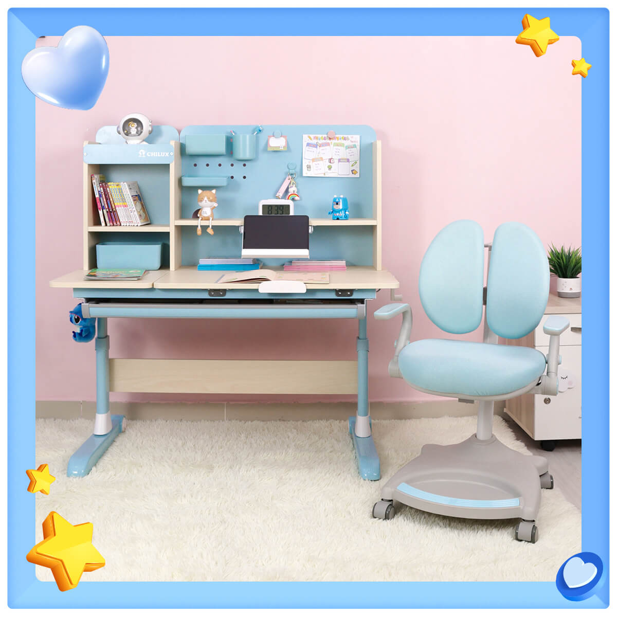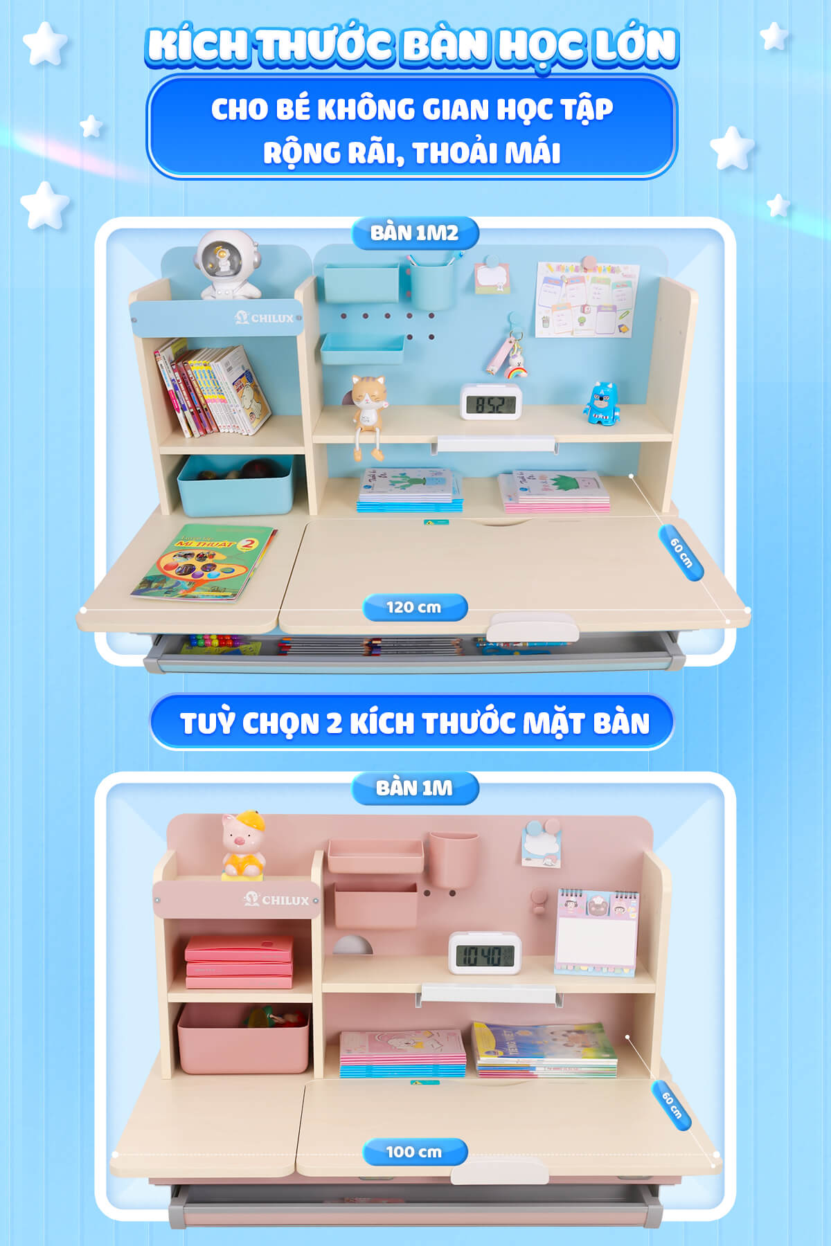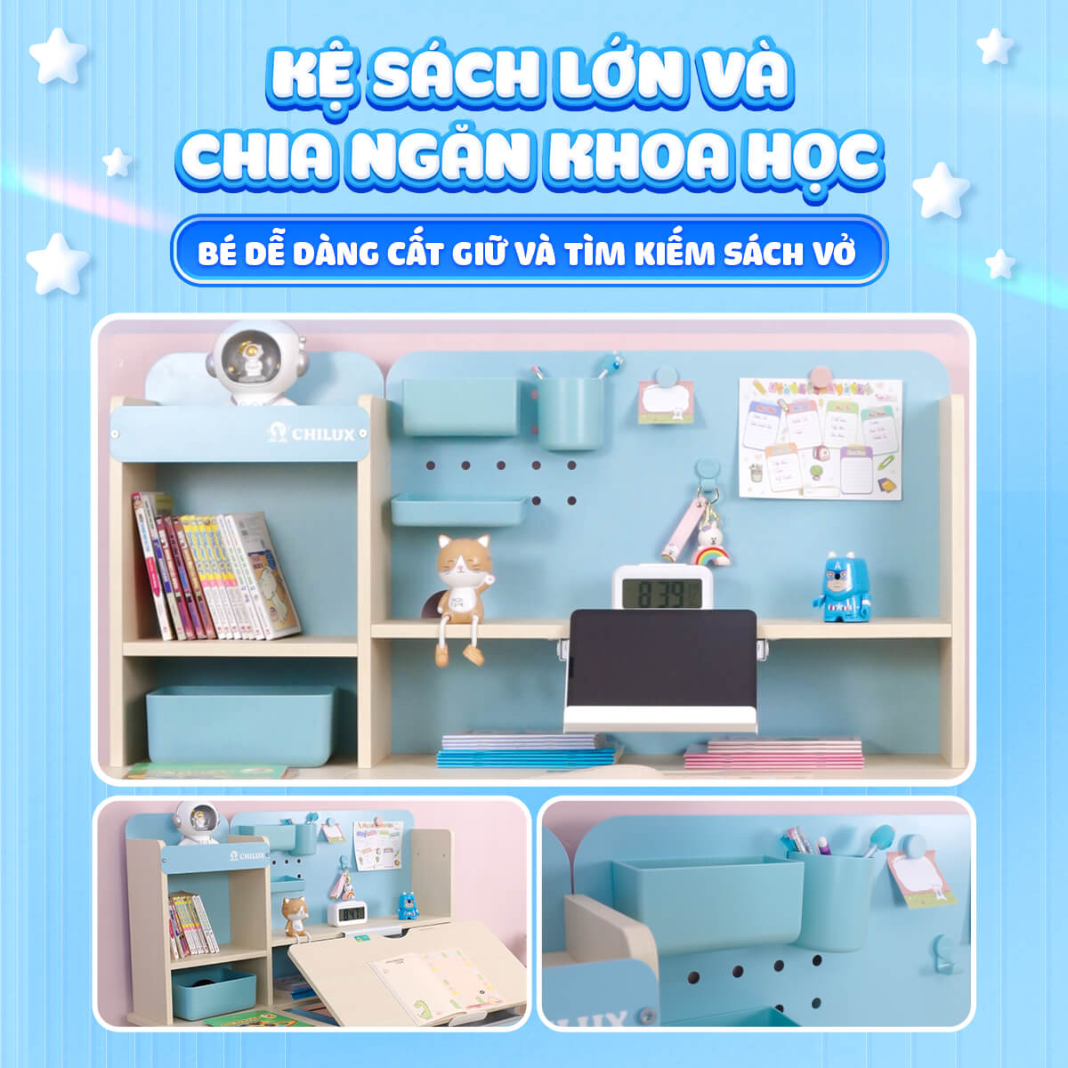 Việc chú trọng đầu tư vào các chi tiết nhỏ từ hộc bàn, tủ, kệ sách cho đến thiết kế của chân bàn, hộp đựng bút, đồng hồ đính kèm trên bàn học giúp sản phẩm có sự hài hòa về thiết kế. Hơn hết Chilux hướng đến bé bởi Chilux hiểu một điều thẩm mỹ tốt sẽ là một trong những cách tạo cảm hứng học tập cho trẻ, bé thích ngồi với góc học tập thân yêu của mình hơn.