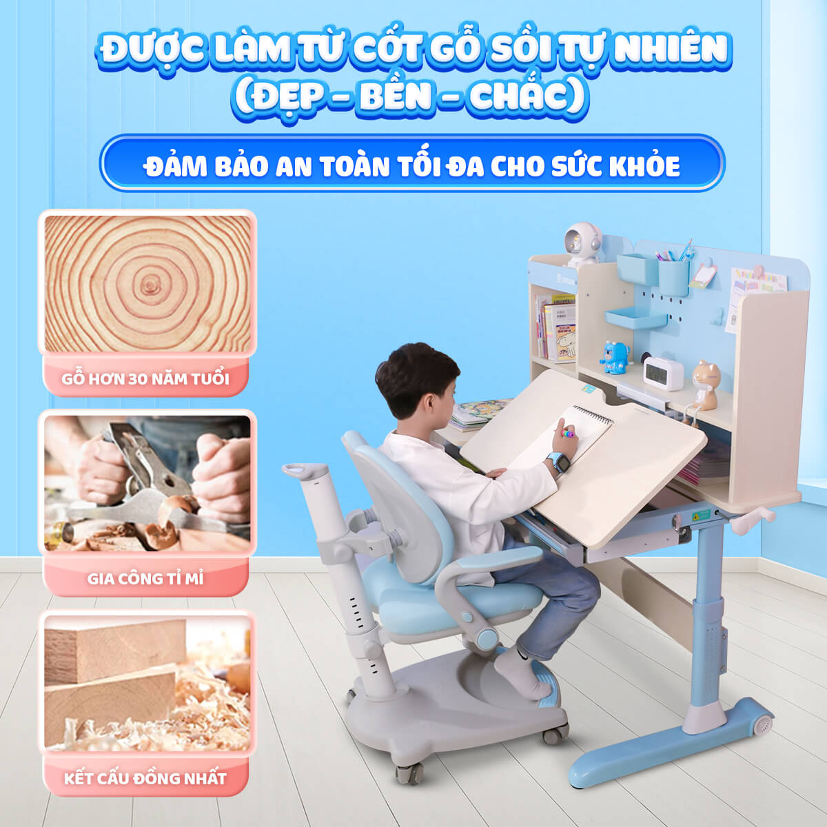 + Chất Liệu Gỗ Tự Nhiên: Chilux sử dụng gỗ tự nhiên nguyên khối với chứng nhận F4 của Nhật Bản, đảm bảo tiêu chuẩn phát thải thấp. Lớp chống xước trên mặt bàn cho phép bé viết và vẽ trực tiếp trên bàn mà không làm hỏng bề mặt.
