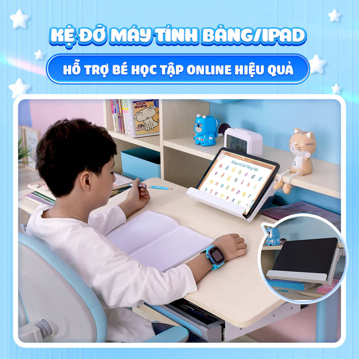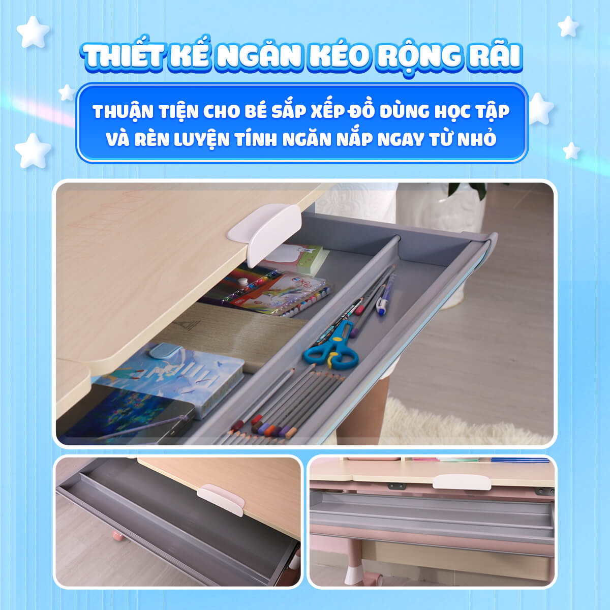 Bàn học là một sản phẩm gắn bó với bé trong suốt những năm học tập đầu đời. Việc lựa chọn một chiếc bàn học cho bé vừa đảm bảo thẩm mỹ, tiện ích,thiết kế khoa học cho tư thế ngồi học của bé thì phải là một sản phẩm mà bé yêu thích để có cảm hứng hơn với góc học tập của mình.