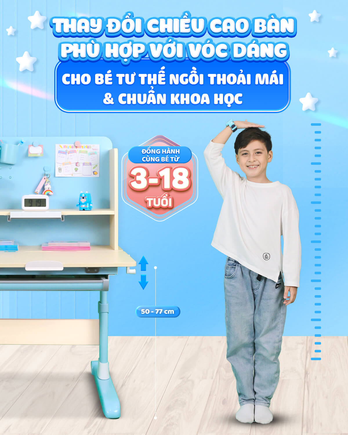 Cả 3 dòng bàn học của Chilux đểu có thể điều chỉnh được chiều cao của chân bàn, từ đó mặt bàn có chiều cao điều chỉnh được từ 53cm đến 77cm so với mặt đất. Kết hợp với ghế ngồi đúng tư thế cũng điều chỉnh từ 35-56cm sẽ giúp sản phẩm phù hợp với nhiều độ tuổi của bé khác nhau, giúp bé ngồi học đúng tư thế
