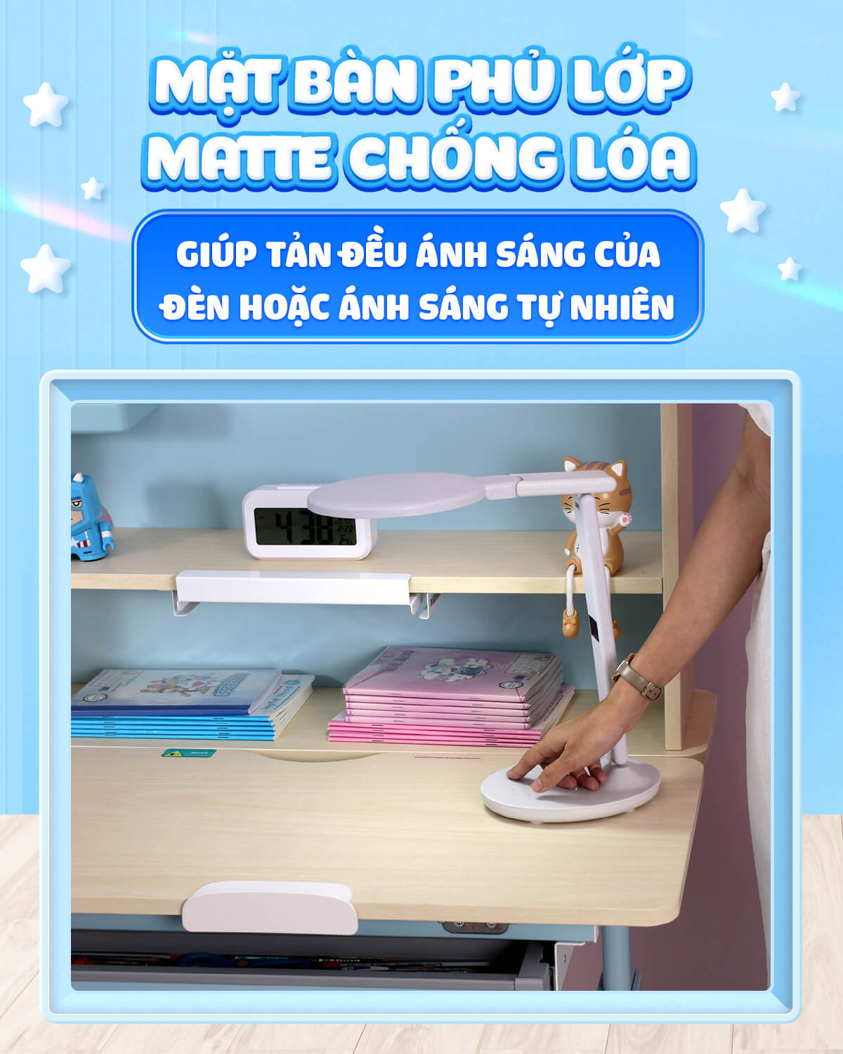 Đồng thời với các dụng cụ hỗ trợ là đèn học đủ tiêu chuẩn ánh sáng, thay đổi được cường độ sáng từ Chilux cũng là một vật dụng giúp bé hạn chế vấn đề này