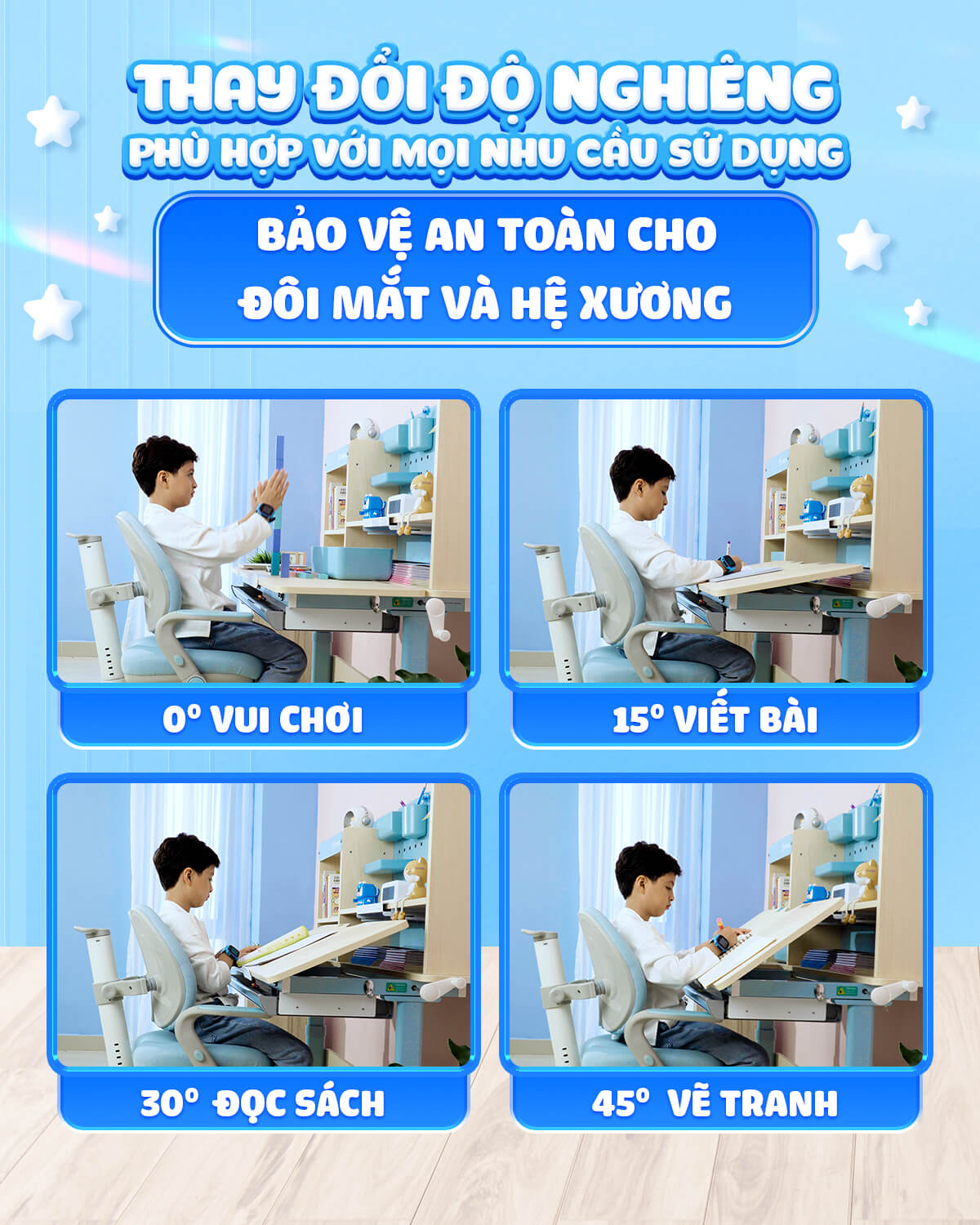 + Điều Chỉnh Góc Nghiêng: Mặt bàn học của các mẫu Chilux có khả năng điều chỉnh góc nghiêng từ 0 đến 50 độ