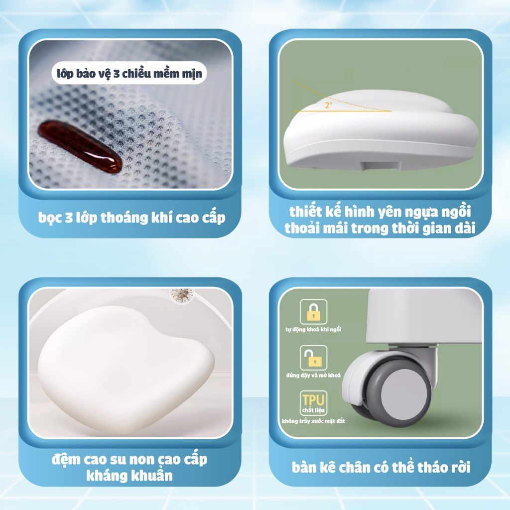 - Khung bàn được làm từ thép có khả năng chịu lực tốt, được bọc một lớp tĩnh điện, đảm bảo an toàn tuyệt đối cho bé.