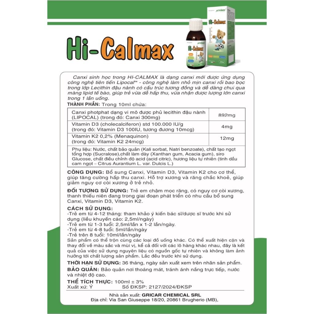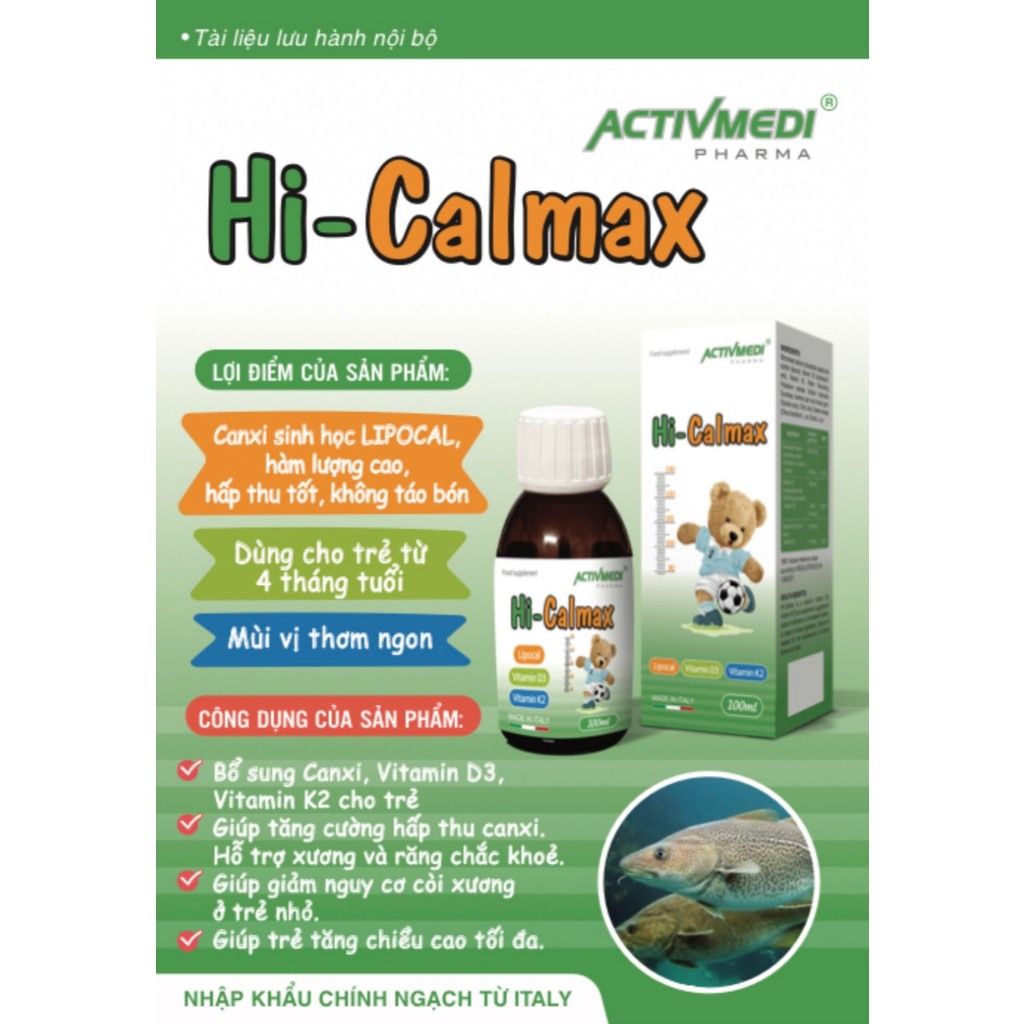 Siro bổ sung canxi HI-CALMAX là sản phẩm bổ sung Canxi, Vitamin D2, K3 giúp tăng cường hấp thu can-xi. Hỗ trợ răng và xương chắc khỏe, giúp giảm nguy cơ còi xương và giúp tăng chiều cao tối đa.