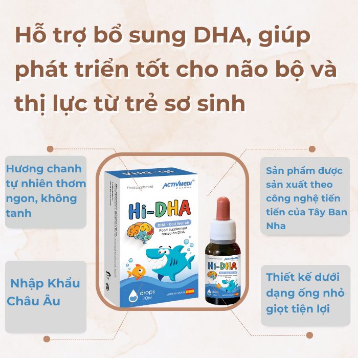 Sản phẩm được sản xuất theo công nghệ tiến tiến của Tây Ban Nha và được kiểm tra chất lượng kỹ lưỡng, không chứa chất gây dị ứng, hương liệu tổng hợp đảm bảo an toàn cho sức khỏe của trẻ sơ sinh và trẻ nhỏ. Bên cạnh đó, Hi-DHA được thiết kế dưới dạng ống nhỏ giọt tiện lợi kết hợp hương chanh tự nhiên thơm ngon, không tanh giúp trẻ bổ sung dễ dàng hơn.